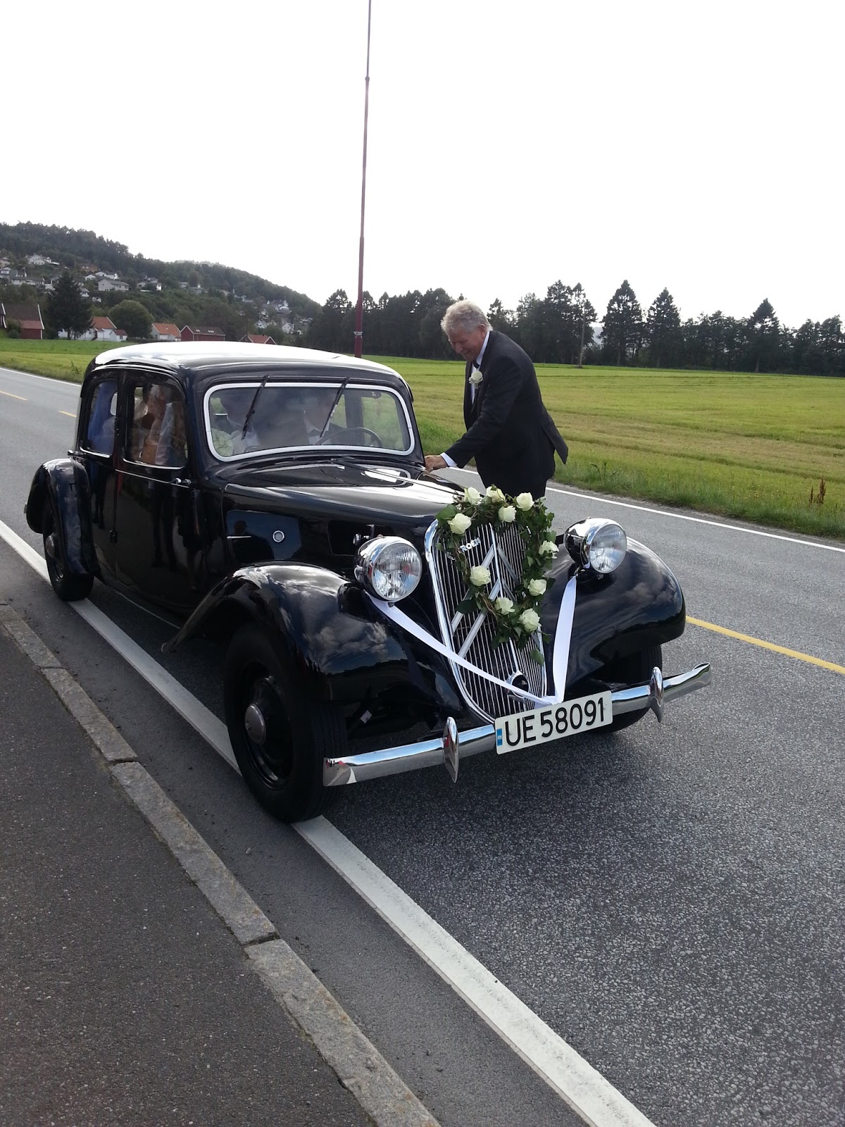 Bilen som brudefølget kjørte er min Onkels gamle Zitrôen. Den har han og min svoger pusset og gnikket på i et års tid. Eller de har vel når sant skal sies hatt hele bilen fra hverandre og bygget den sammen igjen. Flott var den blitt og klar til bryllupsdag ble den. Med blomsterpynt og sløyfe foran og blikkbokser bak!